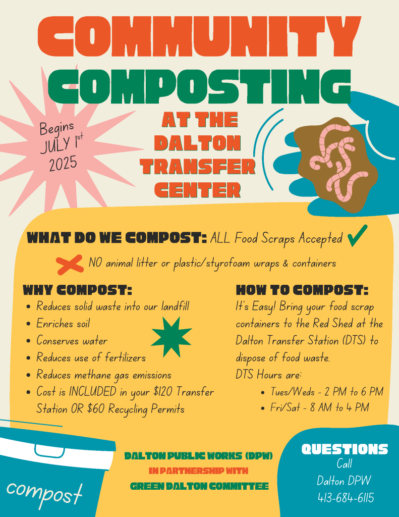 As of July 1, 2023, the Town is now part of the Northern Berkshire Solid Waste Management District. Dalton residents can now participate in upcoming recycling events.